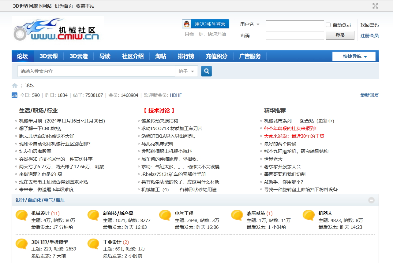 机械社区是一个面向机械行业人士的网络家园,提供丰富的技术交流平台。该社区拥有大量的会员和帖子,覆盖了机械行业的各个方面,包括各类软件应用、机械加工、数控技术、机床、刀具工具、模具、焊接、冶金工程等多个专业领域。