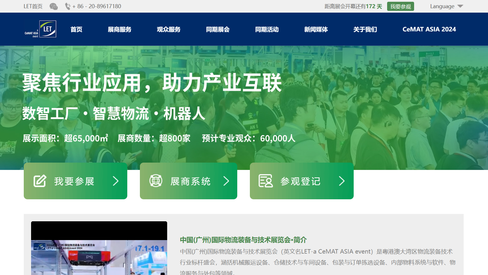 中国(广州)国际物流装备与技术展览会(LET-a CeMAT ASIA event)是粤港澳大湾区物流装备技术行业的标杆盛会。自2010年首次举办以来,已成功举办15届,覆盖机械搬运设备、仓储技术与车间设备、包装与订单拣选设备、内部物料系统与软件、物流服务与外包等多个领域。展会以“智能制造”和“智慧物流”为主题,旨在打造一个一站式物流技术与应用展示平台,促进行业交流合作,推动技术发展和应用。